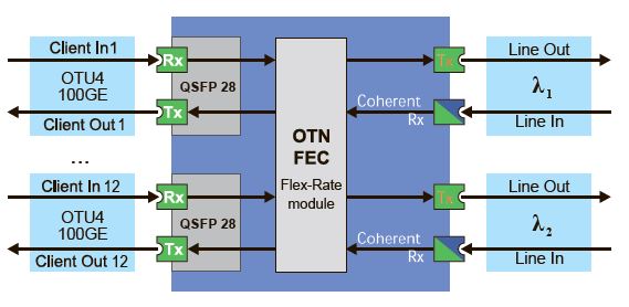 - Передача до 12 клиентских сигналов 100GE или OTU4 RS FEC