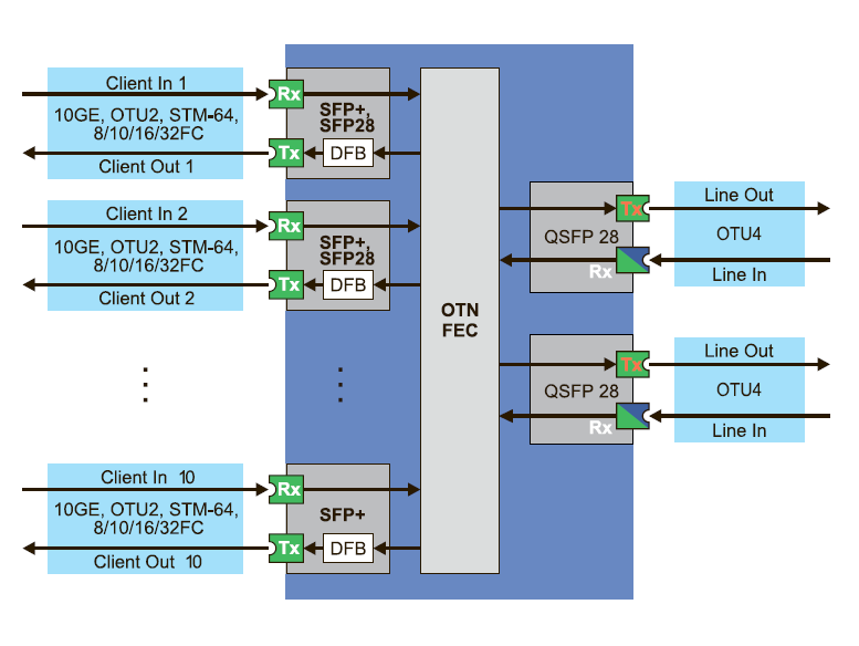 | Стандарт интерфейса | 10GE, OTU2, STM-64, |