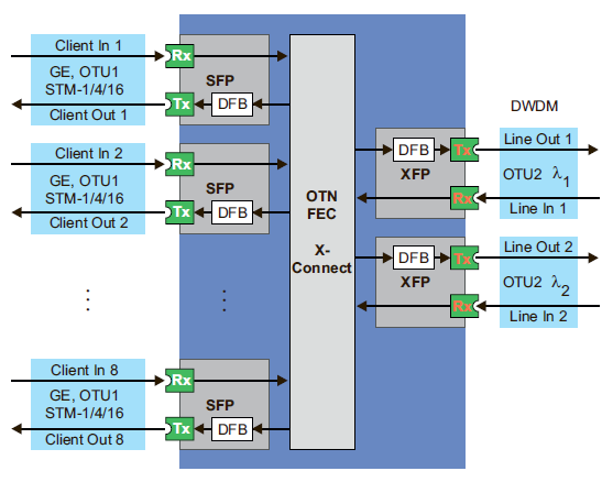 - Передача клиентских сигналов GE, STM-1/4/16, OTU1, 2GFC