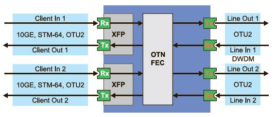 - Передача 1 или 2 клиентских сигналов 10GE, STM-64, OTU2