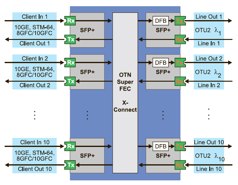 - Передача клиентских сигналов: 10GbE, STM-64, OTU2, 8/10 GFC