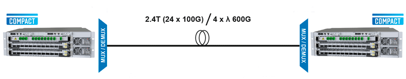 Новое шасси V3-DCI имеет очень высокие показатели по емкости и дальности передачи. «3 в 1» – компактное оборудование включает в себя 2 сервисных слота и плату, объединяющую в себе 8 канальный DWDM-мультиплексор/демультиплексор, усилитель и мультиплексор служебного канала (гибридный оптический блок с усилителем EAM). Нет необходимости в установке дополнительного шасси для мультиплексирования и усиления. Две компактные системы позволяют максимально передать 2,4 Тбит/c на расстояние до 100 км всего 4 длинами волн на скорости 600 Гбит/с. Скорость на линейном порту конфигурируется от 100 до 600 Гбит/с.