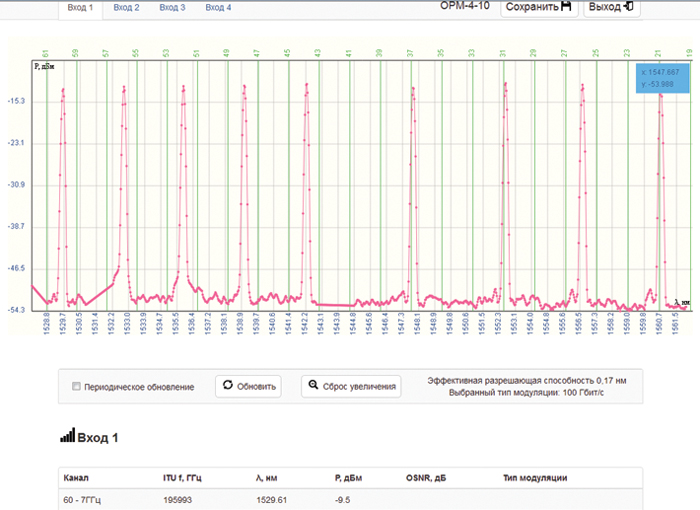 Диапазон измеряемой канальной мощности -40...-10 дБм. Погрешность измерения величины спектрального шума от -55 дБм. Измерение спектра для форматов модуляции 2.5 Гбит/с (прямая и внешняя), 10G, с ограничениями 40G и 100G. Управление блоком производится через веб-интерфейс. В веб-интерфейсе выводится спектр группового оптического сигнала и таблица канальных мощностей для различных типов модуляции. Блок предназначен для использования в шасси «Волга».
